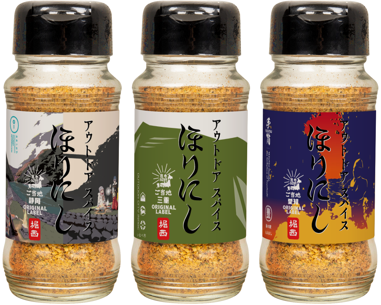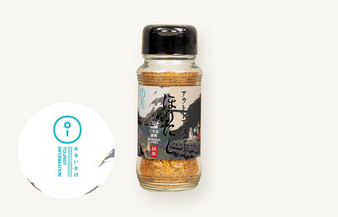 「アウトドアスパイスほりにし」に、地域を象徴するラベルデザインを施した、