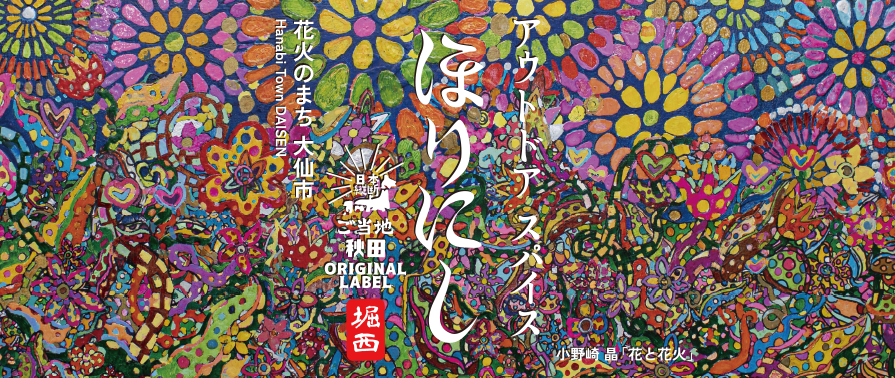 「日本三大花火大会」のひとつ「大曲の花火」をテーマにした地元出身のアーティスト小野崎晶氏の作品『花と花火』をあしらったラベル