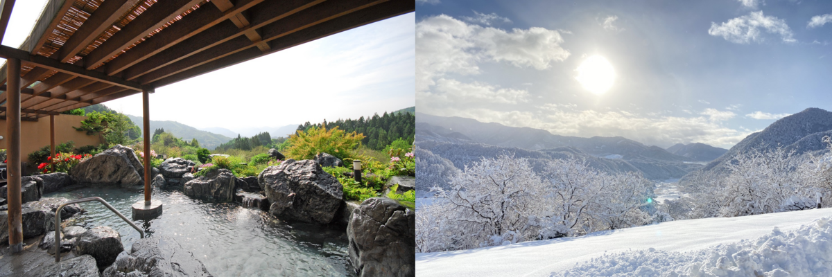 9の温泉と、旅館や民宿、ホテル・ペンションといった約200軒の宿泊施設があり、冬には5つのスキー場で11月上旬から5月中旬まで豊富な積雪とサラサラのパウダースノーが楽しめます。