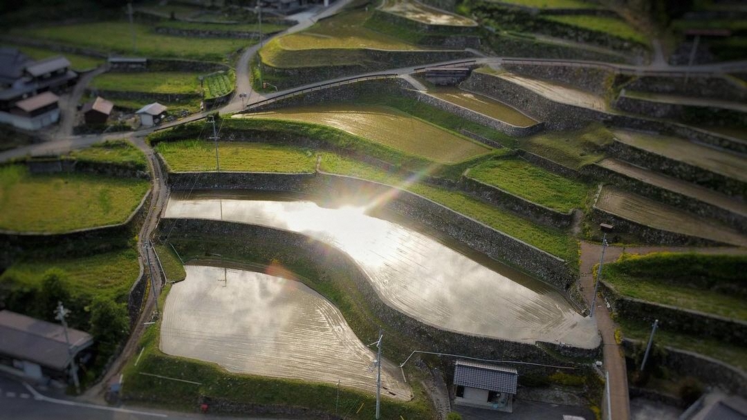 「つなぐ棚田遺産」に選定された岩座神(いさりがみ)の棚田は、圧巻の景色です。春には水鏡のように景色を映す水田、夏には緑一色に染まる青田、秋には黄金の稲穂、冬には雪が降ると幻想的な真っ白な雪景色へと変化します。