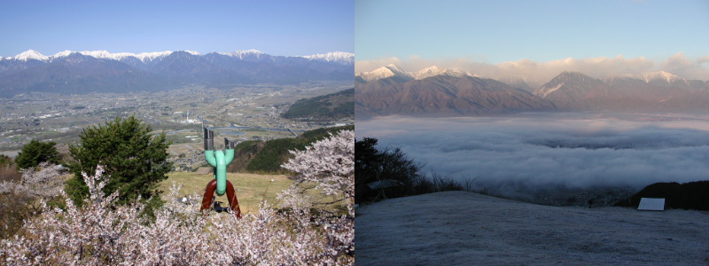 東側には里山が広がり、特に標高933mの長峰山からは、安曇野と北アルプスが織りなす絶景が一望できます。車で山頂までアクセスできることもあり、気軽に登れる山として人気があります。