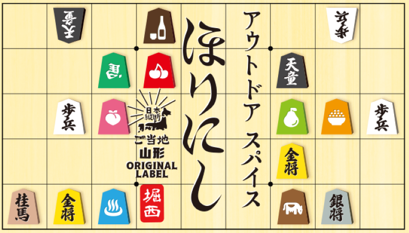 日本一の生産量を誇る将棋をベースに天童市の名産さくらんぼ、ラ・フランス、米、桃、温泉、日本酒、天童牛を天童市独自の色鮮やかな将棋駒としてあしらったラベル