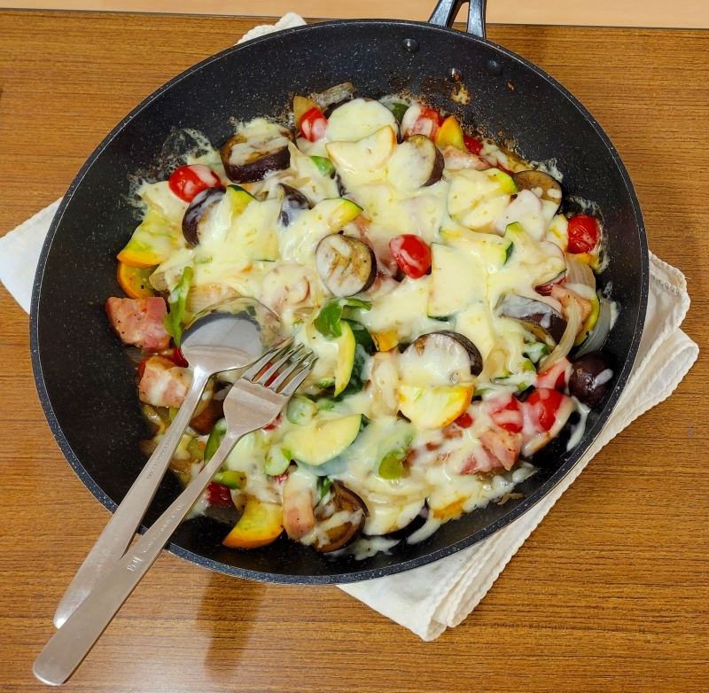 フライパンにサラダ油をひき、ベーコン・たまねぎを炒めたらなすとズッキーニを中火で炒め、最後にミニトマトを入れる。